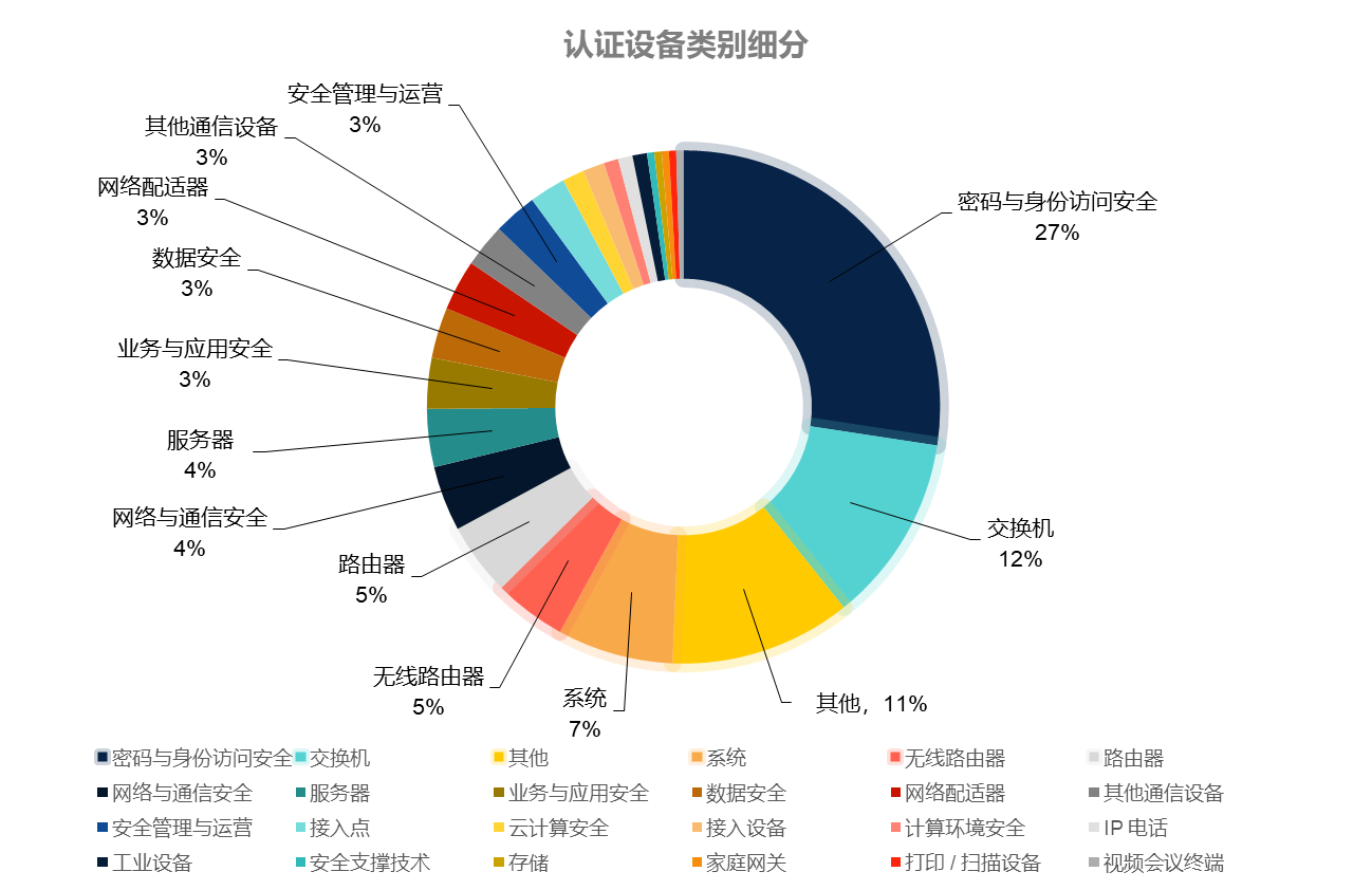 尤其值得关注的是,安全类设备成为认证占比最高的类别,总量占比达到40%,体现了“IPv6规模化部署进入深水区后,安全能力成为刚需底座”的产业共识。其中,密码与身份访问安全设备获得60个认证(占比27%),覆盖22家企业,是认证数量最多的细分类别。该数据清晰反映出:在政企数字化转型深入推进的背景下,身份认证、访问控制、加密与可信通信等能力,已成为IPv6网络落地过程中的核心关切与优先投入方向。
